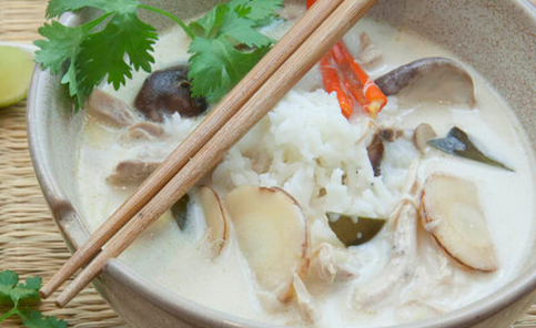 泰式椰汁雞湯:泰式椰汁雞湯是曼谷名湯,已有數百年的歷史。因為椰奶帶甜味,比較膩滯,所以一般泰國菜中,椰奶多用作咖喱菜肴之調味或調色,極少作烹湯用。但此菜利用椰奶代水煮湯,別具一格。湯中放如南姜,香茅,芫荽,朝天椒,魚露,青檸檬汁,砂糖。湯煮沸后,再放入雞塊和已撕碎的檸檬葉,煮沸后倒入椰奶,加入調味料及朝天椒,略滾即可。